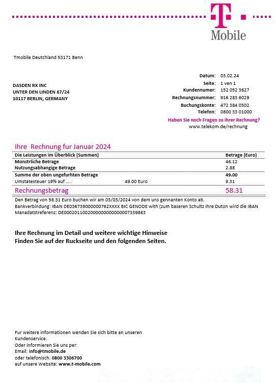 Germany T Mobile business utility bill template in Word and PDF formats download template file