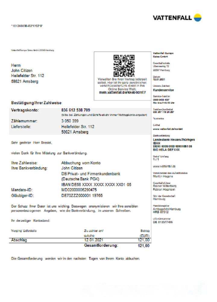 Germany VATTENFALL utility bill download template file