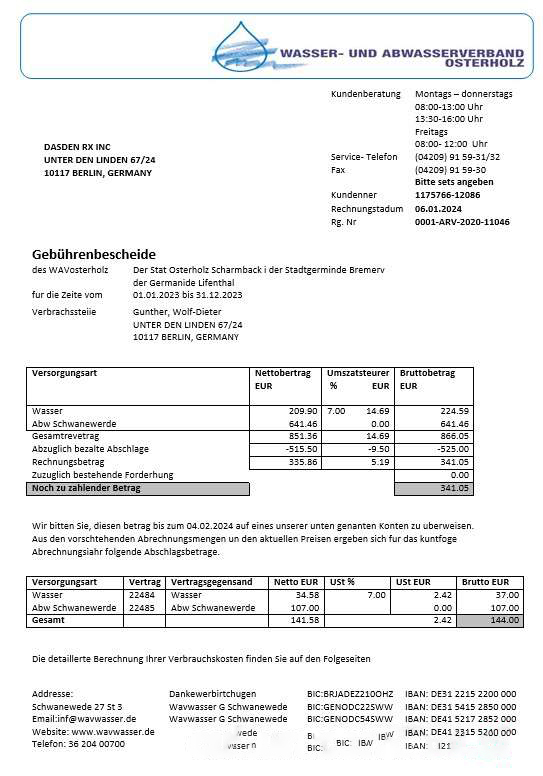 Germany Wavwasser business utility bill template in Word and PDF formats download template file