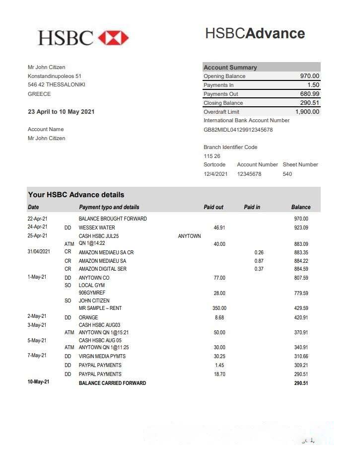Greece HSBC bank statement easy to fill template in Excel and PDF format download template file