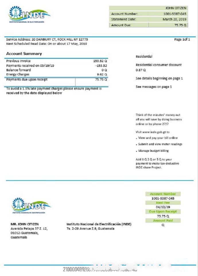Guatemala INDE Instituto Nacional de Electrificación electricity utility bill download template file