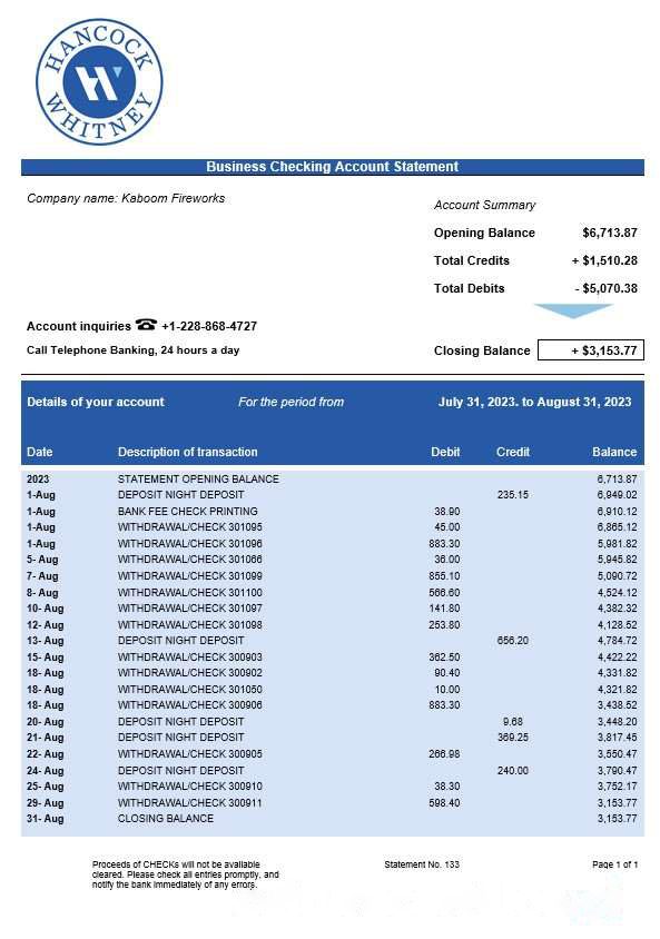 Hancock Whitney Bank business checking account statement Word and PDF template download template file