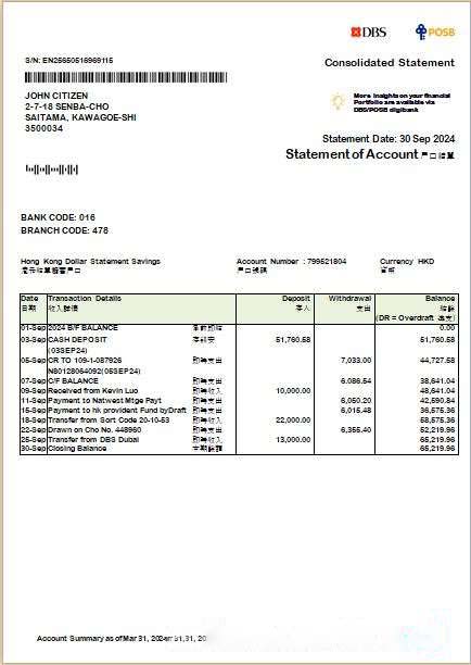 Hong Kong DBS bank consolidated statement Word and PDF template scr download template file