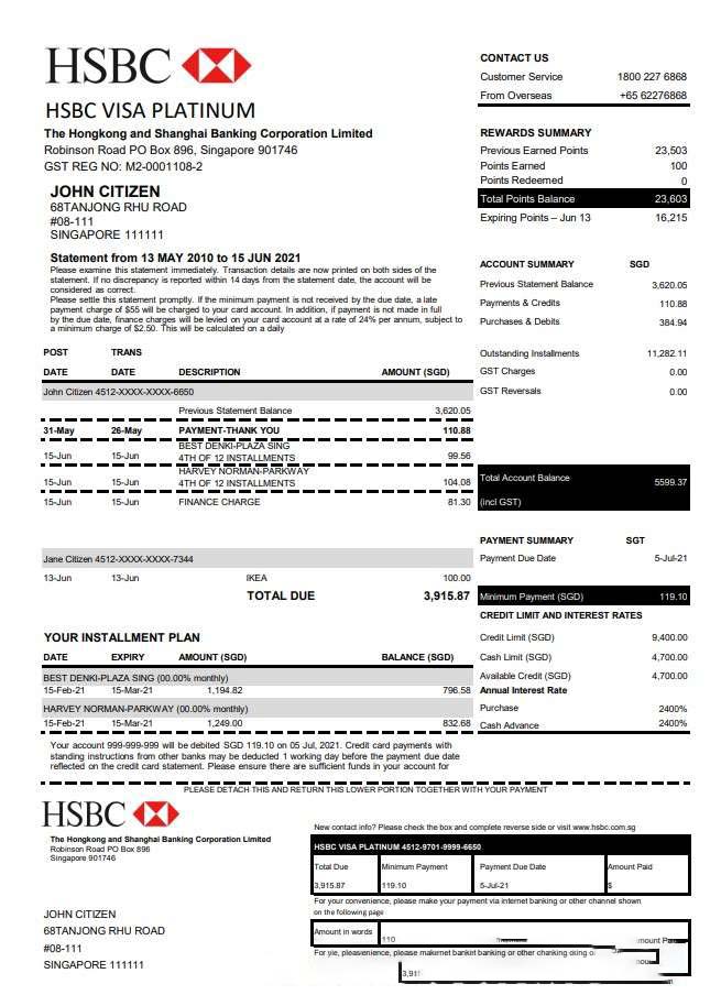 Hong Kong HSBC bank Visa Platinum credit card statement template in .xls and .pdf file format download template file