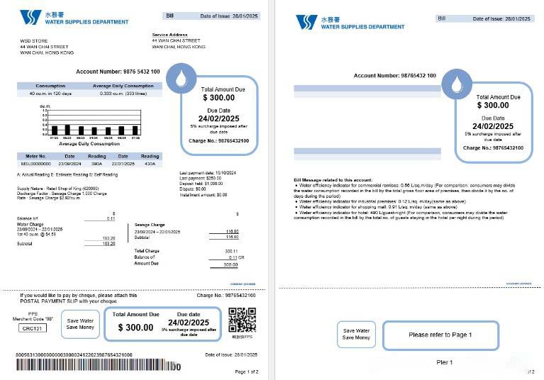 Hong Kong Water Supplies Department utility bill editable template download template file