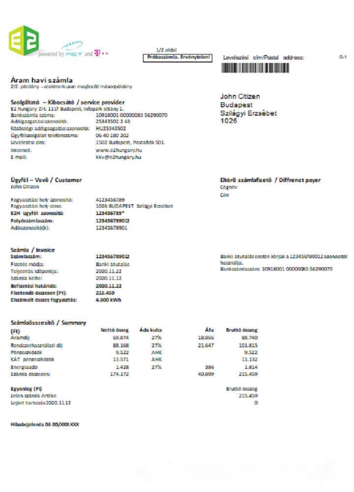 Hungary E2 utility bill Word and PDF format download template file