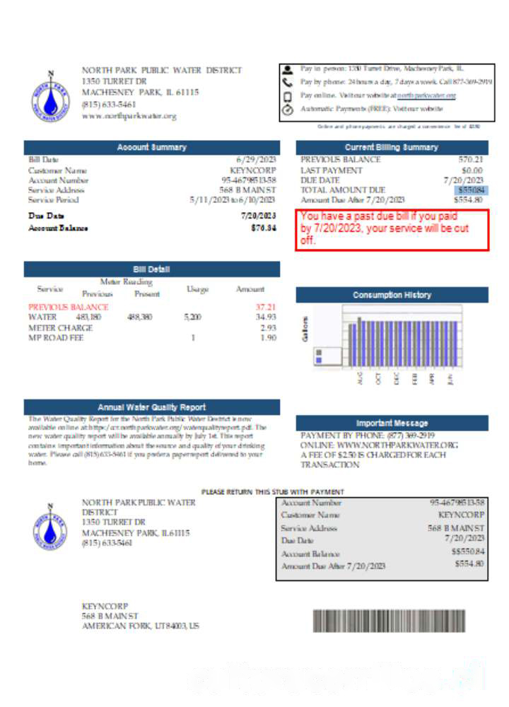Illinois North Park Public Water District IL utility business bill, SCR download template file