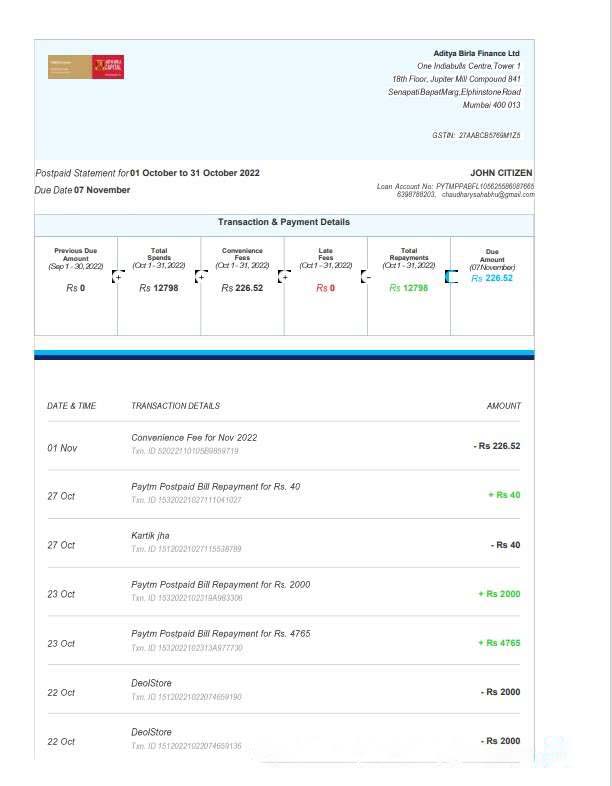 India Aditya Birla Finance Ltd bank statement template, Word and PDF format, 3 pages download template file