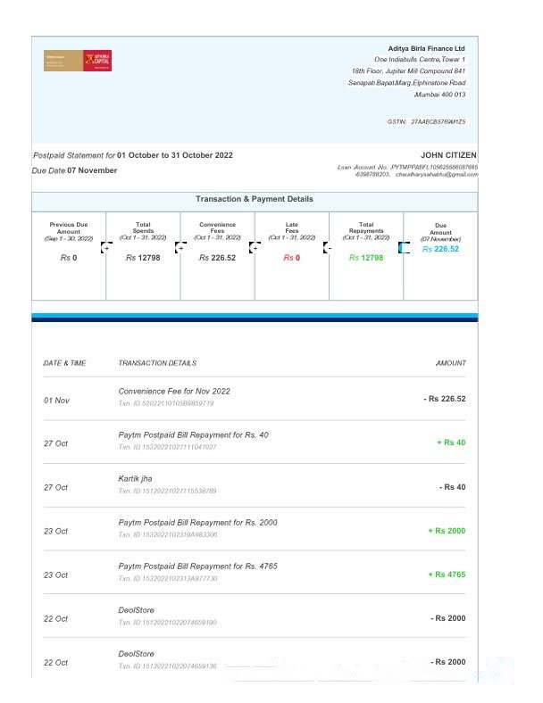 India Aditya Birla Finance Ltd fake bank statement Word and PDF template, 3 pages download template file