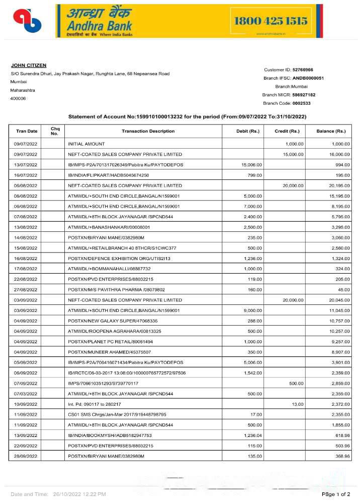 India Andhra bank statement Word and PDF template, 2 pages p1 download template file