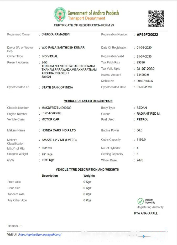 India Andhra Pradesh state vehicle registration certificate download template file