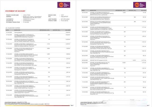 India AU Small Finance Bank statement of account Word and PDF template, 2 pages download template file