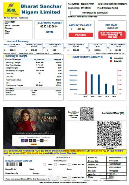 India Bharat Sanchar Nigam Limited utility bill template in Word and PDF formats, version 3 download template file
