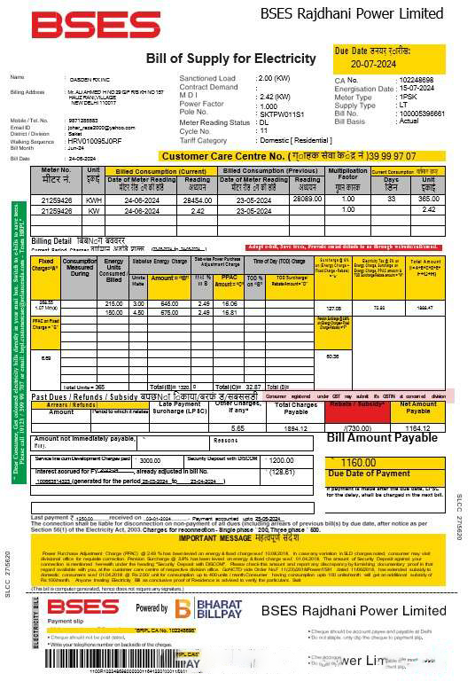 India Bses electricity business utility bill Word and PDF template trang download template file