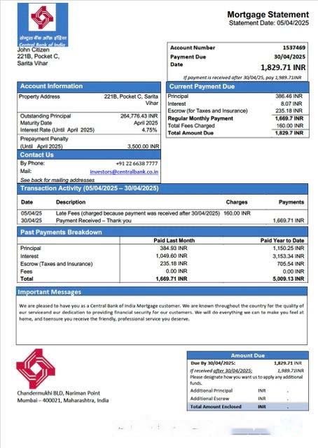 India Central Bank of India mortgage statement Word and PDF template download template file