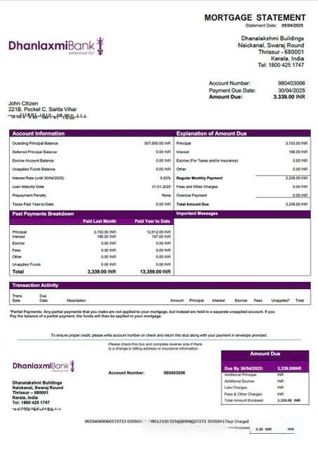India Dhanlaxmi Bank mortgage statement Word and PDF template download template file