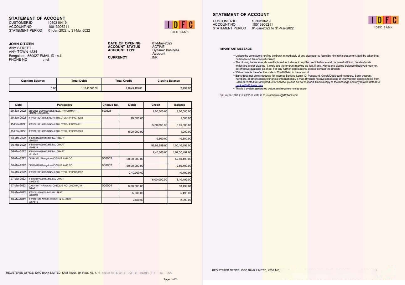 India IDFC bank statement 2 pages, new version download template file