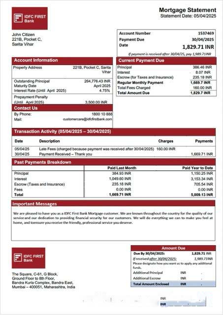India IDFC First Bank mortgage statement Word and PDF template download template file