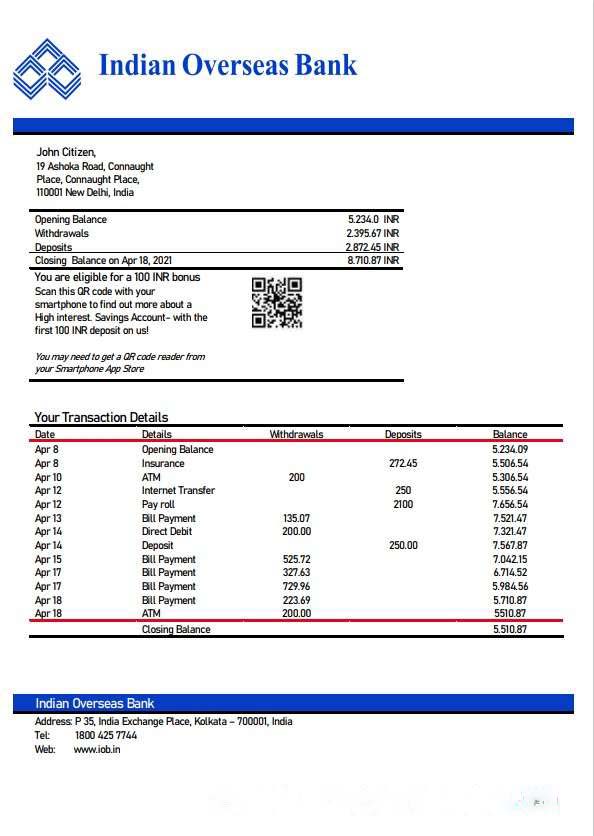 India Indian Overseas Bank statement template, Word and PDF format download template file