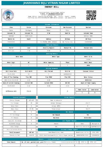 INDIA JHARKHAND BIJLI VITRAN NIGAM LTD. utility bill Word and PDF template download template file