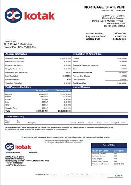 India Kotak Mahindra Bank mortgage statement Word and PDF template download template file