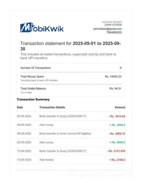 India MobiKwik transaction statement Word and PDF template download template file
