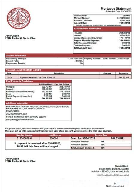 India Nainital Bank mortgage statement Word and PDF template download template file