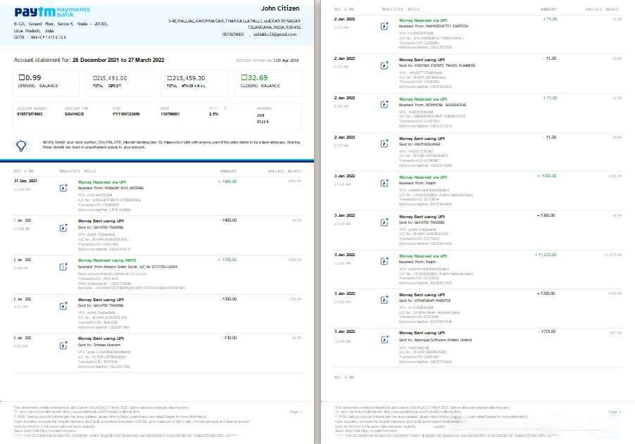 India Paytm Payments bank statement template, Word and PDF format, 2 pages download template file