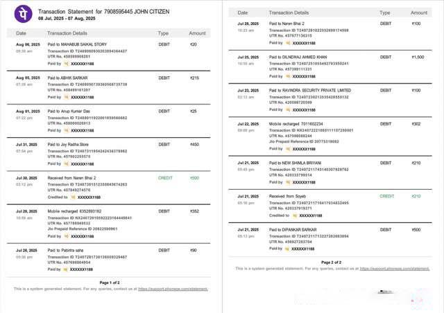 India PhonePe transaction statement Word and PDF template, 2 pages download template file