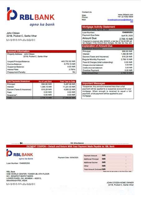 India RBL Bank mortgage statement Word and PDF template download template file