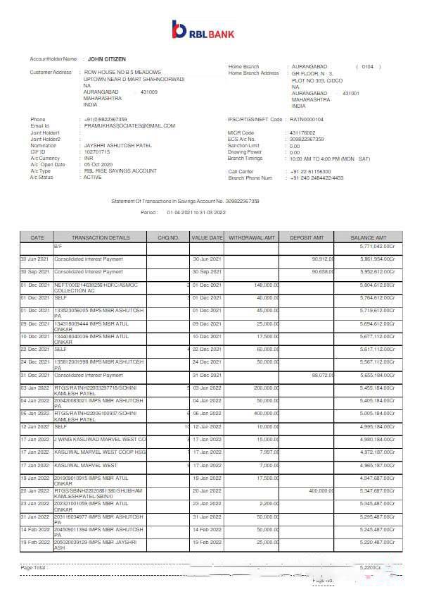 India RBL bank statement Word and PDF template scr download template file