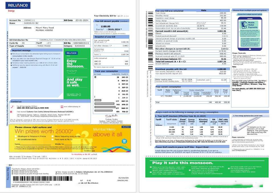 India Reliance Energy business utility bill Word and PDF template, 2 pages download template file