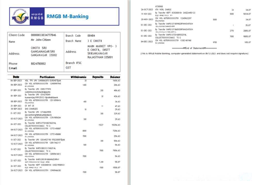 India RMGB bank statement Word and PDF template, 2 pages scr download template file