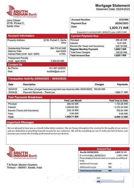 India South Indian Bank mortgage statement Word and PDF template download template file