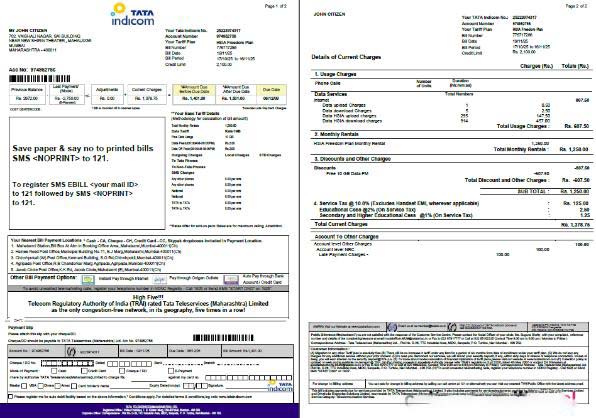 India Tata Indicom utility bill template in Word and PDF formats, 2 pages download template file