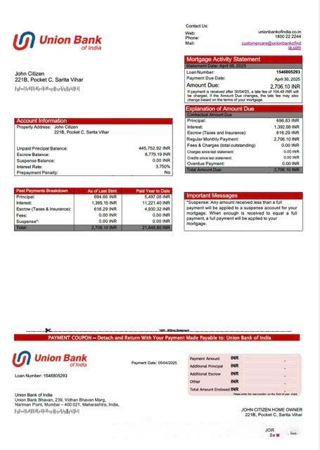 India Union Bank of India mortgage statement Word and PDF template download template file