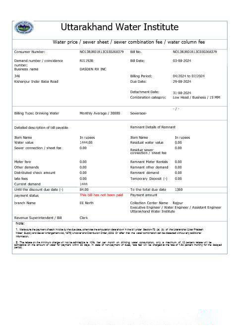 INDIA UTTARAKHAND WATER business utility bill Word and PDF template download template file