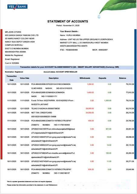 India YES Bank statement of account Word and PDF template download template file