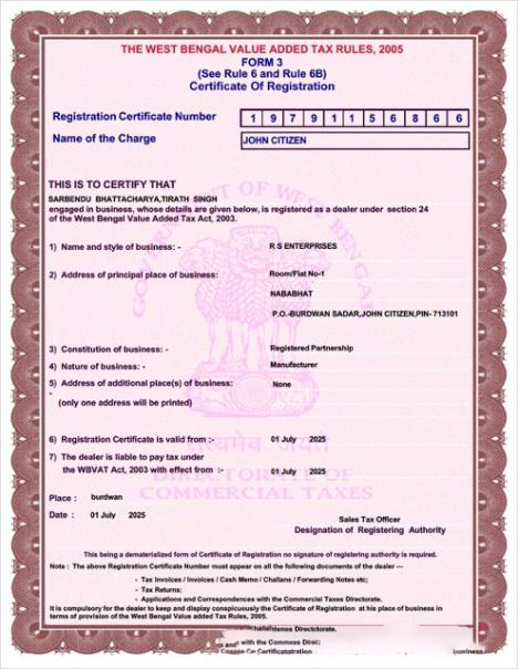 India?West Bengal?certificate of VAT registration?Word and PDF template download template file