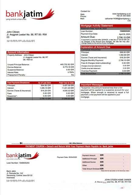 Indonesia Bank Jatim mortgage statement Word and PDF template download template file