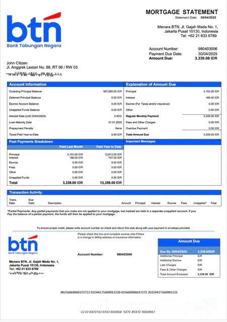 Indonesia Bank Tabungan Negara (BTN) mortgage statement Word and PDF template download template file