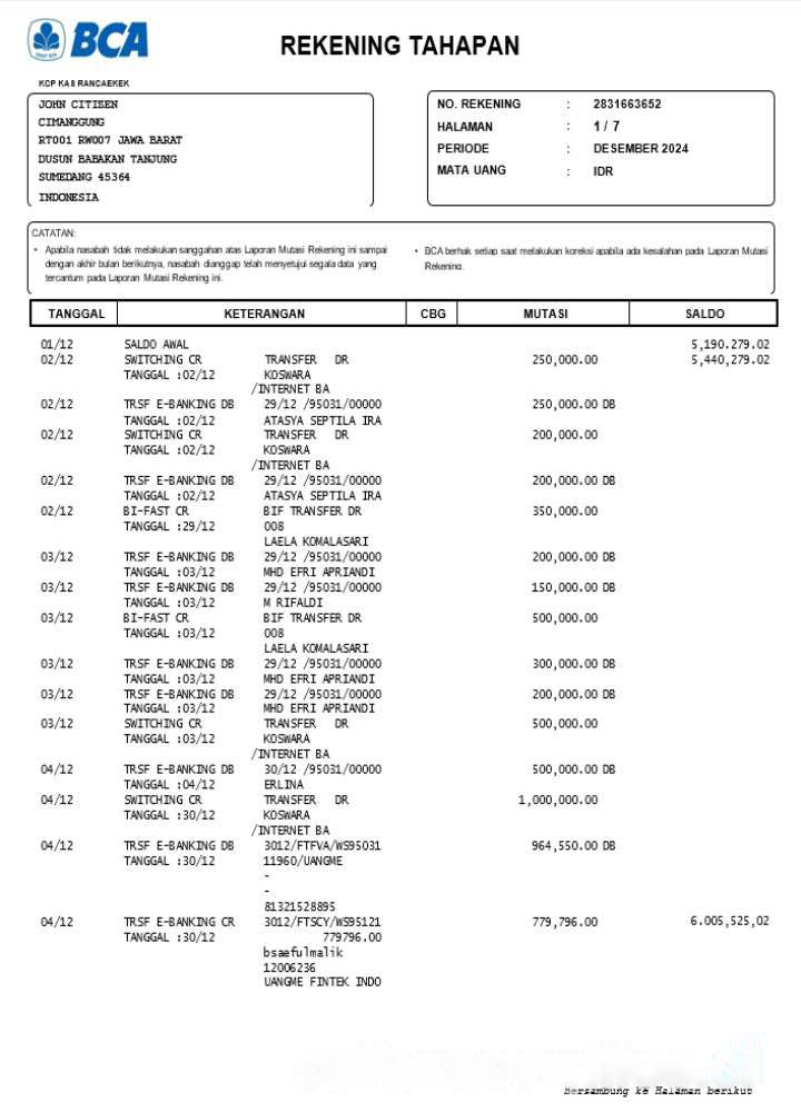 INDONESIA BCA bank statement template, Word and PDF format, version 2 download template file