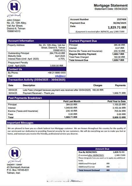 Iran Bank Saderat Iran mortgage statement Word and PDF template download template file