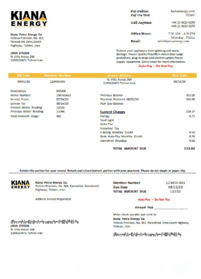 Iran Kiana Petro Energy Co utility bill download template file