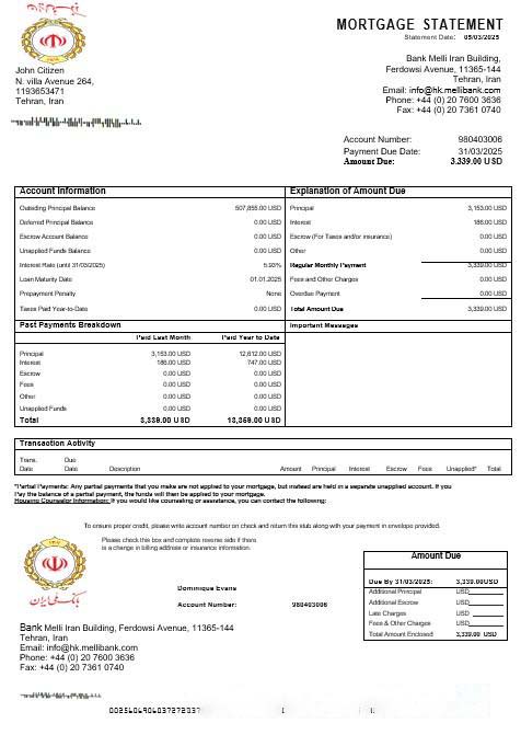 Iran Melli Bank mortgage statement in Word and PDF formats download template file
