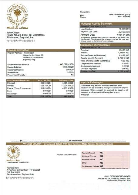 Iraq Rasheed Bank mortgage statement Word and PDF template download template file