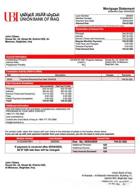 Iraq Union Bank of Iraq mortgage statement Word and PDF template download template file