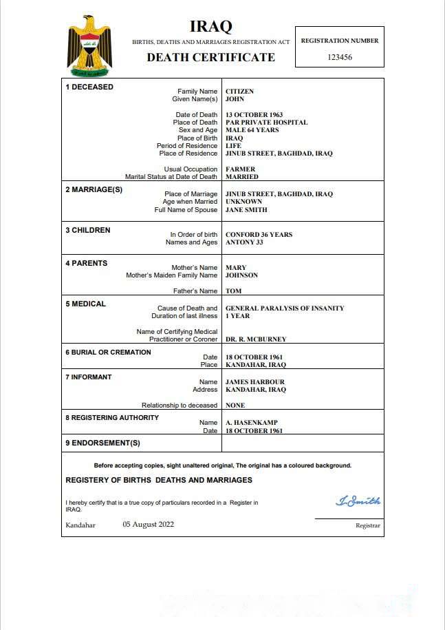 Iraq vital record death certificate Word and PDF template download template file