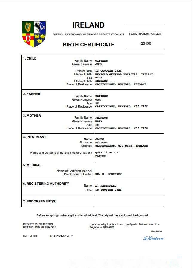 Ireland birth certificate Word and PDF template download template file