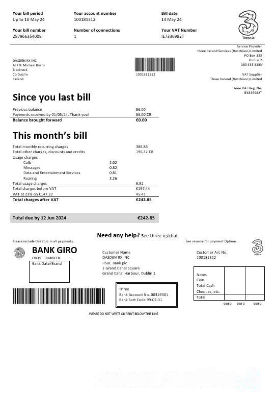 Ireland Three.ie business utility bill template in Word and PDF formats download template file